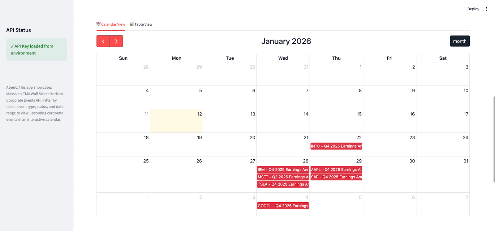 To show how the Corporate Events endpoint can be used in a real-world workflow, we built the Corporate Events Calendar Dashboard. It is a Streamlit application that turns raw API responses into an interactive calendar, event filtering, and detailed event information.