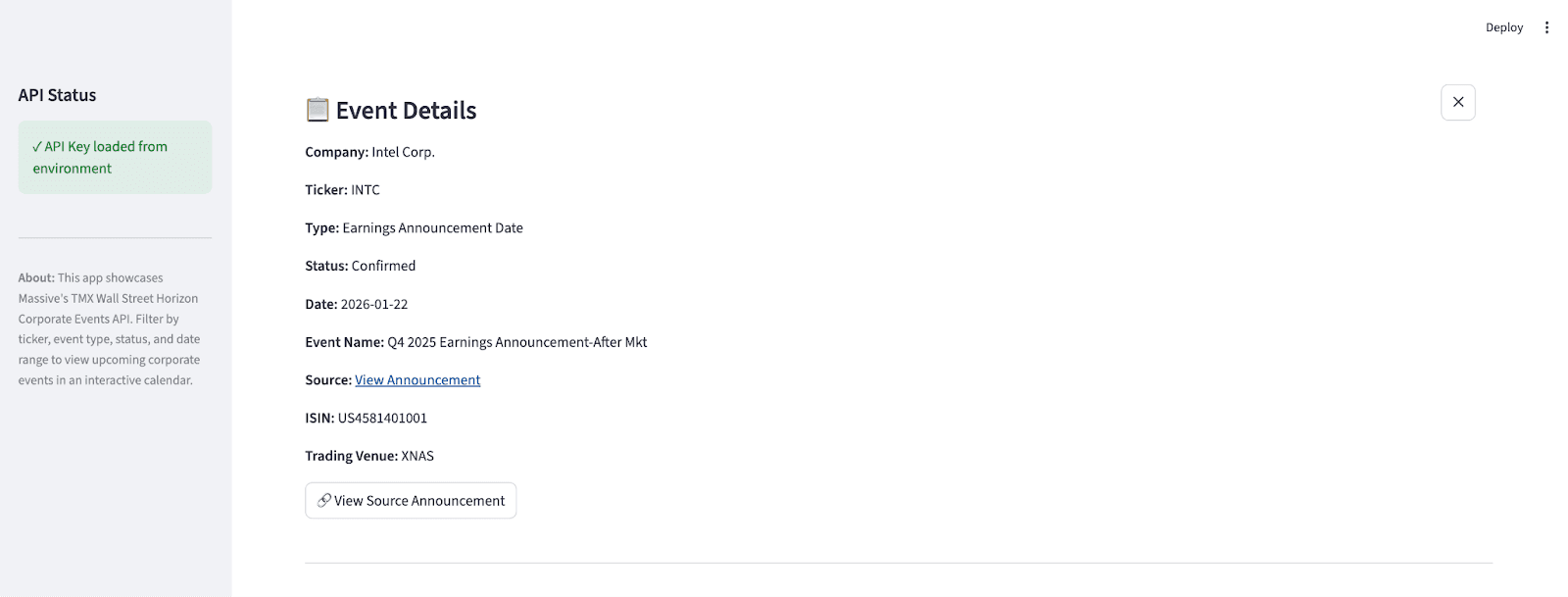 This demo is intentionally designed to be both educational and extensible. You can run it as-is to explore TMX Wall Street Horizon Corporate Events data, or use it as a reference for building your own event tracking tools, dashboards, or production workflows on top of Massive's API.