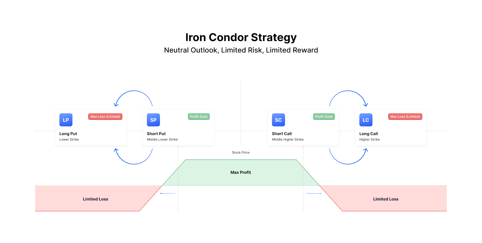 An iron condor is a four‑leg options strategy built from two credit spreads with the same expiration: