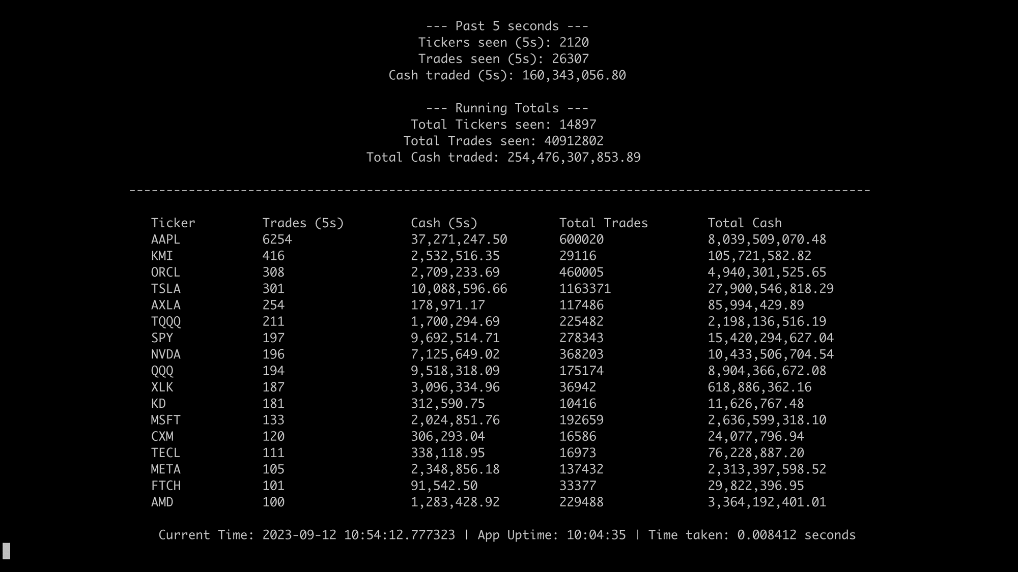 Beyond the immediate 5-second window, the application maintains an ongoing tally termed "Running Totals". This tracks the total number of unique tickers seen since the app started, the grand total of trades, and the cumulative cash value across all these trades. These running totals give users a broader perspective on market activity over time, highlighting the most consistently traded stocks and their cumulative financial impact.