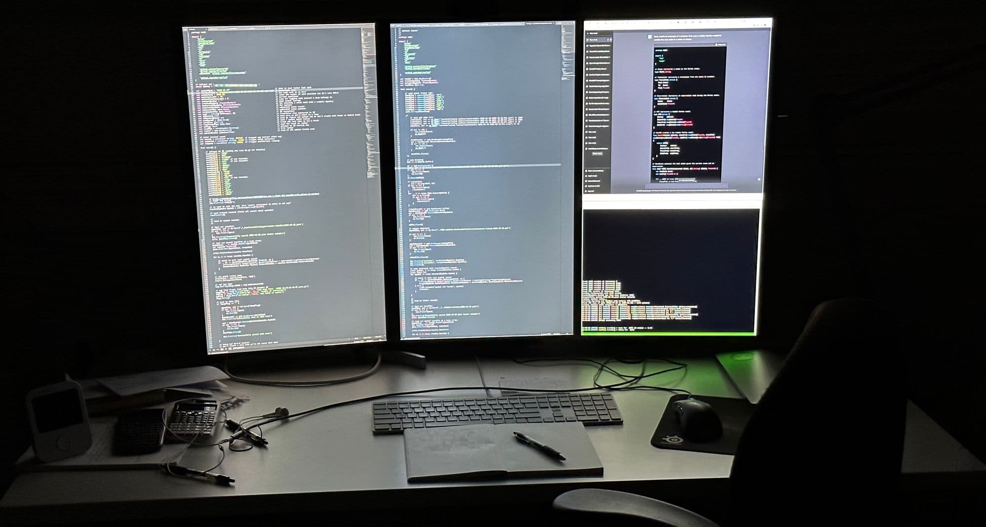 No tale of algorithmic trading would be complete without the obligatory screenshot of an impressive multi-monitor setup. Behold my data-driven empire, brought to life on three vertical 4K screens.