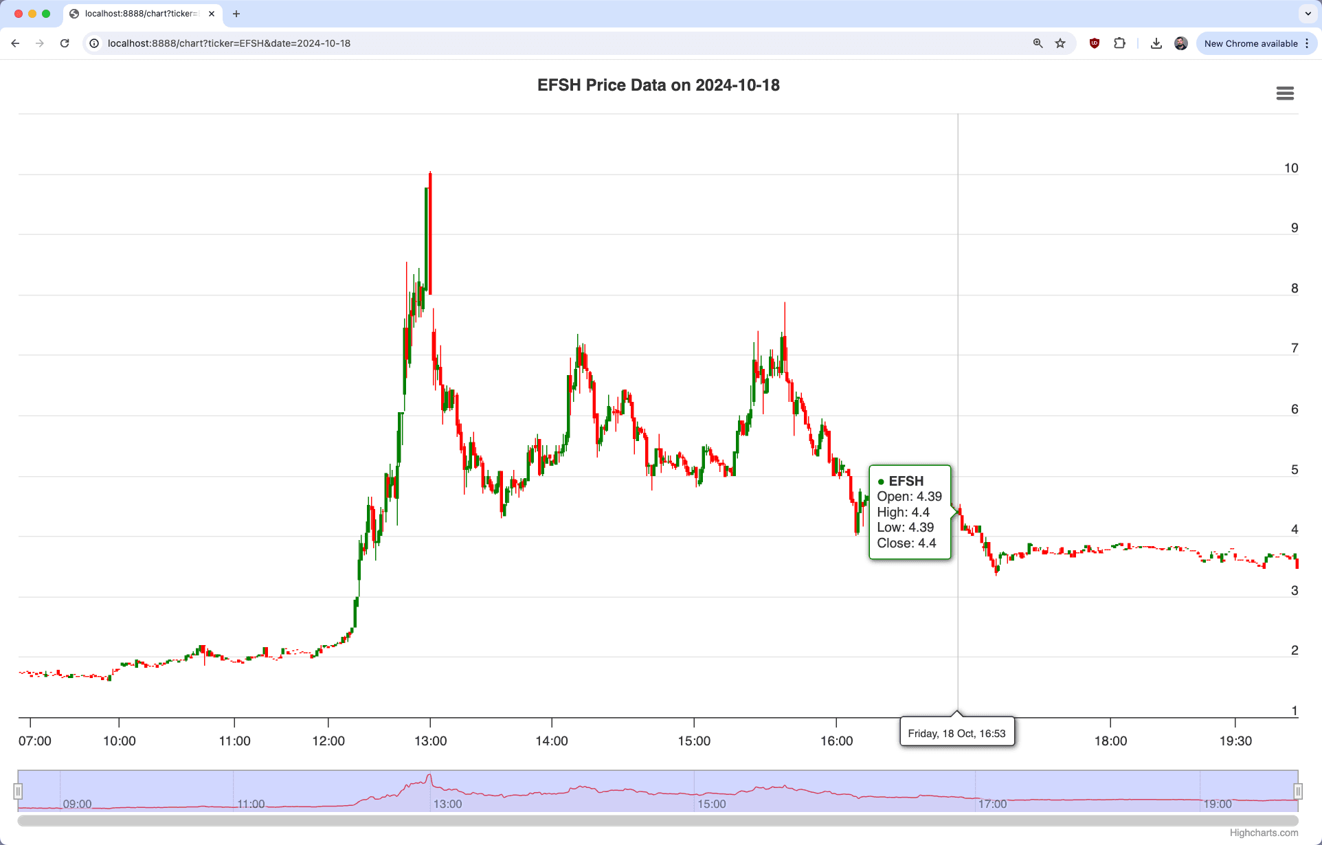 Having queried the lookup table, we've successfully identified a list of anomalies based on specific criteria set for trading volumes. Now we can find potentially interesting market events or anomalies, yet the output merely lists these anomalies without letting us really see them. To fix this, the next section will introduce a web interface that overlays our lookup table. This tool enables us to select a specific day and then visually explore the detected anomalies events through aggregated candlestick data, hopefully providing a more intuitive understanding of the event by looking at the trading activity.